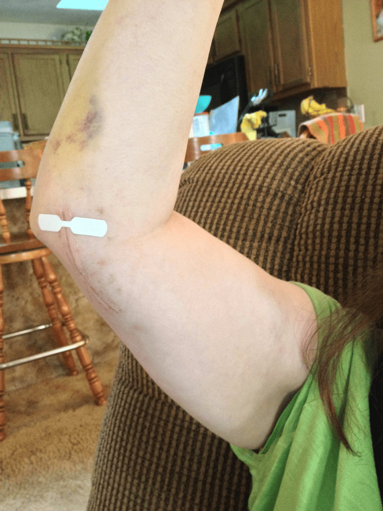 After taking off the cast I was fitted with a terribly annoying brace which I have to wear 24/6. The thing is a pain in the ass to sleep in. I was also told not to lift anything with my arm. That means NOTHING; and no driving for a few more months. It does still hurt and is very uncomfortable because there are stitches on each side of my elbow. It is hard to get comfortable. I also have a major lack of energy. I am looking forward to getting back to the gym to start getting back into shape.