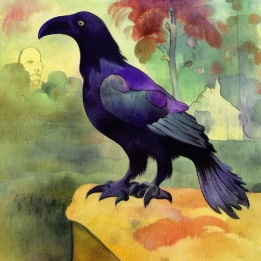 • Gothic RAVEN, surreal, harmonious details, Compositional Unity, Compositional Balance, Watercolor painting, watercolors, wet brush, 12k resolution,In the style of French Post-Impressionist artist Eugène Henri Paul Gauguin, experimental use of colour and Synthetist style
