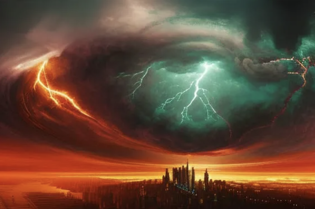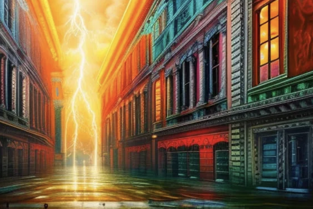 • mega detailed, intricately detailed city, endless city-punk macro photography, engulfing infinity thunderstorm, fluid perfect oil painting, complementary Color, CGSociety, ZBrushCentral, 64 megapixels, digital illustration, detailed background intricately detailed hyperdetailed renaissance painting