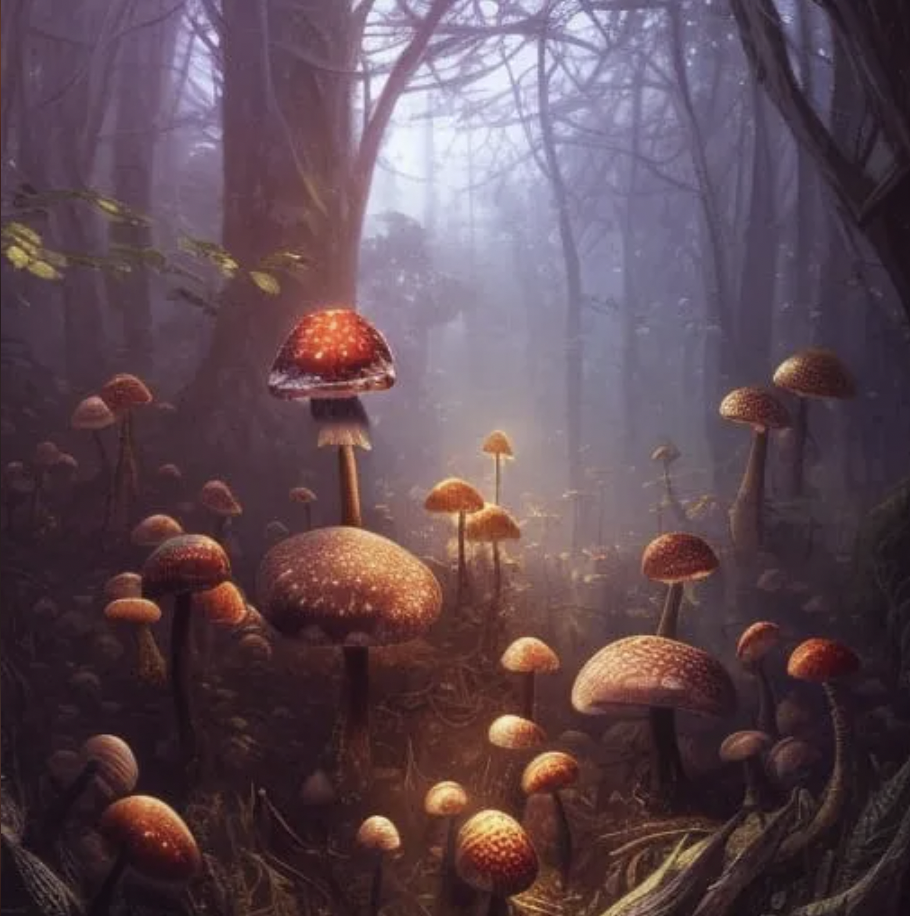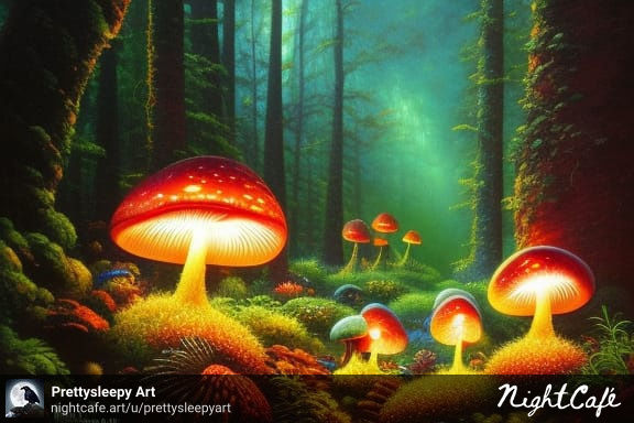 Prompt: hyperdetailed glowing amanita mushrooms fantastical twilight lighting, award winning details, raking sunlight, Intricate detail, mixed media, astounding artwork, backlit fantasy, backlit whimsical breathtaking colors, oil painting, deep color, intricate detail, fantasy 8k resolution, a dog situation, in the style of Mary Vaux Walcott and John Constable