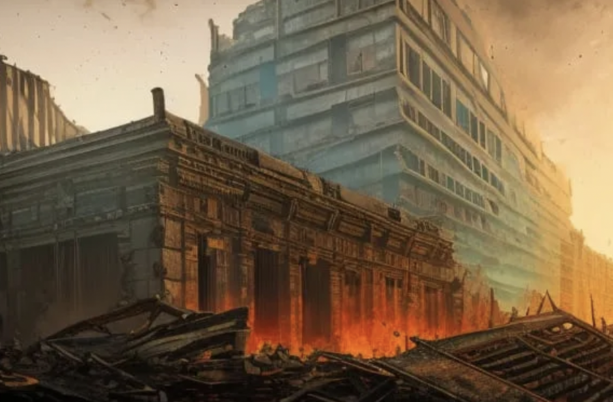 • burned-out shell of a building ruins., Fine Prints: Japanese, shiny triadic colours, maximalist matte painting, 8k, cel-shaded, rococo, hyperdetailed, photorealistic, a masterpiece, trending on artstation, Darek Zabrocki, Greg Rutkowski, Jesper Ejsing, Jean-Baptiste Monge, Jonas de Ro
