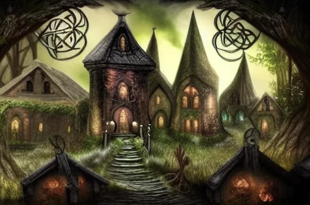 • gothic village, woodland, detailed dark magical elements tree spells skull books raven potion, runes, antler, underworld ornate face paint, volumetric lighting potions Celtic symbols cross triskelion smoky witchy, spectral lighting effects, glowy