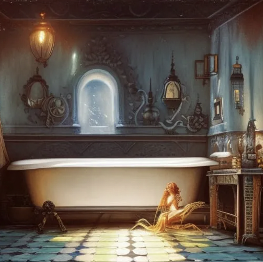 • Greg Rutkowski style vintage claw-foot-bathtub, fantastical twilight lighting, hyperdetailed glowing water, award winning details, ultradetailed bathroom, raking sunlight on glowing tiles, Intricate detail, mixed media, oil painting In the style of John Constable