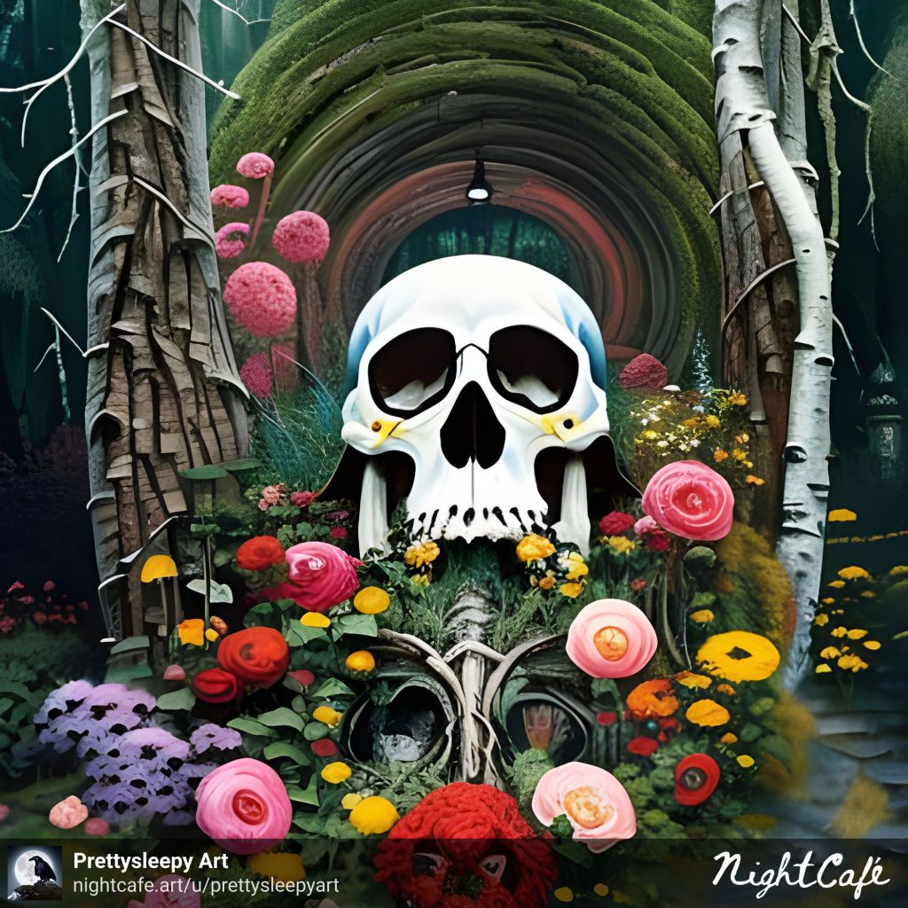 “Tunnel. underworld. dead birch tree forest. dominating fantasy. painting. painted by a florist. “painting of a cute whimsical, skull with the a pile of flowers, bones, and magic elements by Beatrix Potter, & Richard Scarry & Jean-Baptiste Monge. artistic painting cute adorable professional picture”” Weight:1