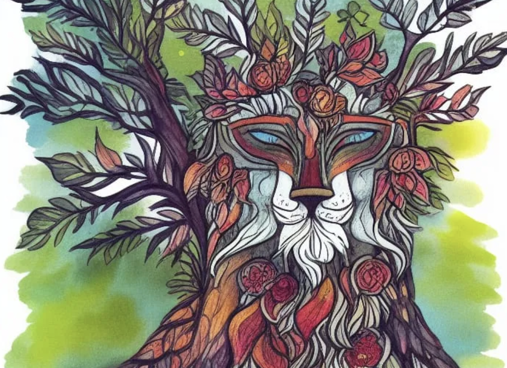 • gaelic forest spirit, illustration, guardian lion, floral flower fog, Formal, folk art folklore, leaves, tree, Foreground found ornate ink drawing watercolor Freeform fe, complementary colors