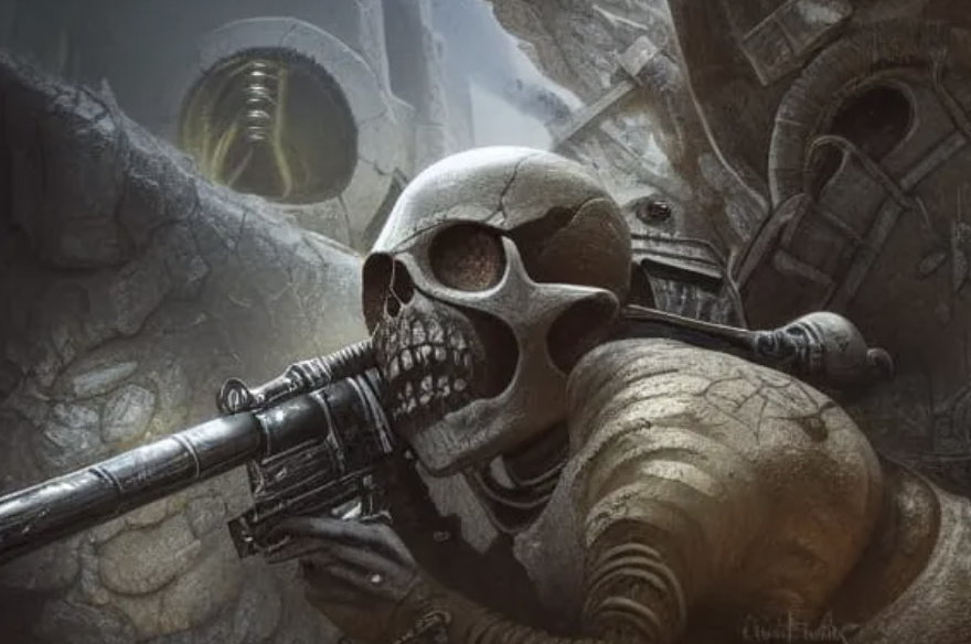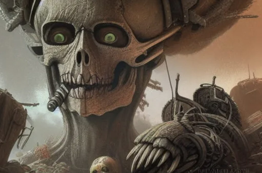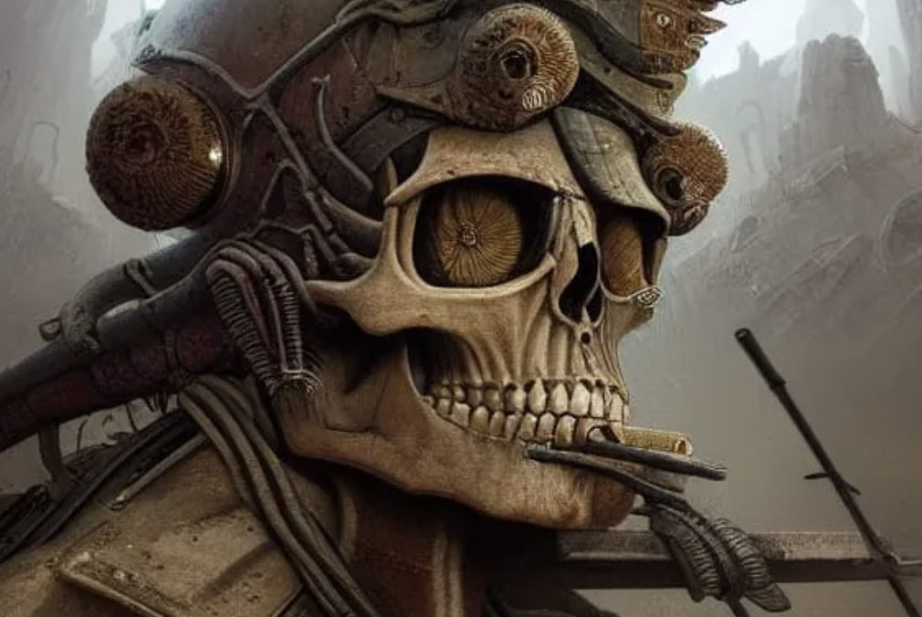 • In The Art Style Of George Walton Lucas Jr And James Gunn Gamekit Diego Gisbert Llorens Richard Anderson Hyper-detailed Giger Skull On Stone Wall Up Close In Foreground World War 2 Precise rendering, war, mythical, clearly detailed illustration, ready for battle