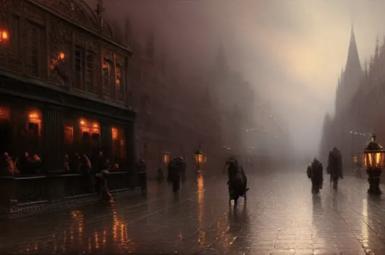 • cinematic perspective, twilight time, glowy lights, 1880s London Street, hyperdetailed reflections, rainy, Rule Of Thirds, Illustration, Cobblestone, Deep Color, Fantastical, Intricate Detail, Splash Screen, painting in the style of krenz cushart, Henri Gervex, M.C. Escher, Max Ernst