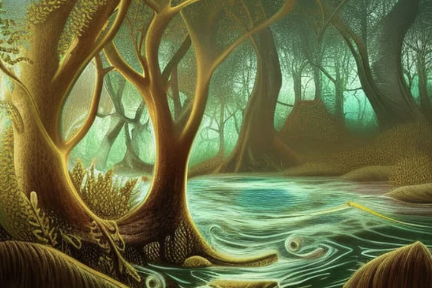• beneath the magical sea, digital art dark realistic fantasy close up of ultra detailed n the art style of john o’brien inman folklore, Intricate detail, forest background, digital art in the style of John Samuel Agar Mary Vaux Walcott, Diego Gisbert Llorens, artwork is a hyperdetailed photoillustration with dynamic lighting, illustration