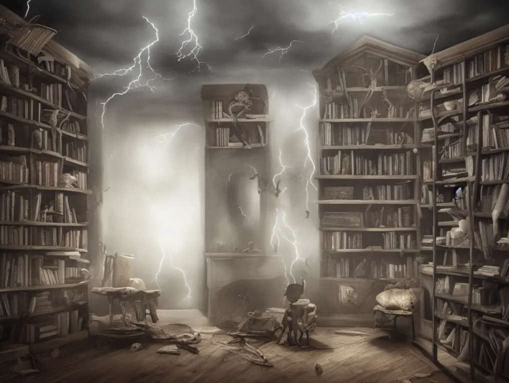 • inside an old house with elements of Lightning and storm clouds, in foreground is a skull wall, eerie mood and feel, 8k, HDr, smooth digital artwork, deep complementary colors, bookshelves covering the dark walls, a beautiful watercolor painting