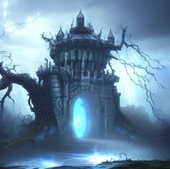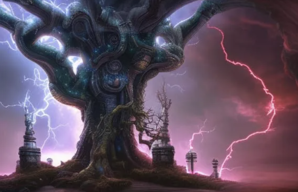 • megadetailed castlepunk castlecore portal-tree, cyberportal-tree, fantasy, Lightning And Storm Clouds, ritualpunk edges, cinematic stunning, detailed matte painting, deep color, fantastical, intricate detail, splash screen, complementary colors, fantasy concept art, 8k resolution trending on Artstation Unreal Engine 5 intricately detailed Ukiyo-e
