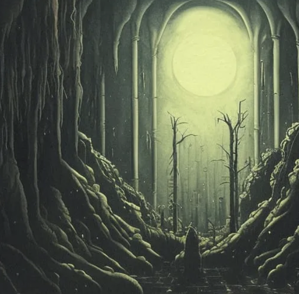 • Poster showing Eerie trees in toxic gas, Deep Color, Intricate, 8k resolution concept art, Natural Lighting, Beautiful Composition, Old sanctuary of death A perfect complete masterpiece painting by Philip Guston, Ralph Steadman, Eyvind Earle, Stephen Gammell, Ralph Bakshi, Frank Frazetta Link