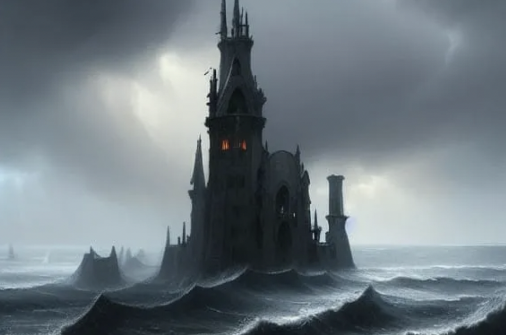 • gothic art, illustration in the style of Randy Berrett. towers of a gothic castle on the beach with crashing ocean waves, ominous stormy sky sinister, dark fantasy concept art, by Greg Rutkowski, dynamic lighting, intricately detailed, Splash screen, deep color, Jordan Grimmer