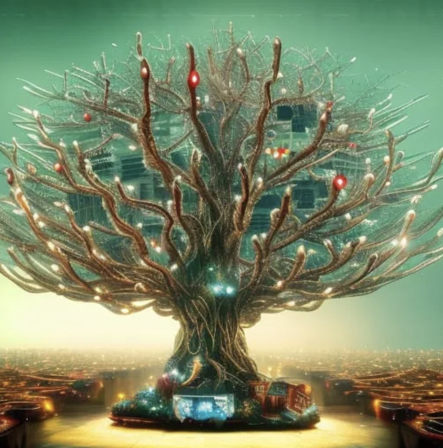• techno-tree-show, hyper-amazing incredible striking and wildly detailed award-winning strange xmas tree, of unique intricate branchpunk Christmas tree in the style of Octavio Ocampo, Epic cinematic atmospheric 8k resolution, cyberpunk 2099 blade runner 2049 neon