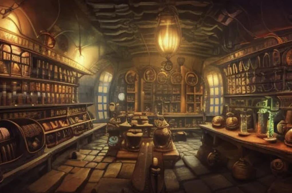• Inside a steampunk potions alchemist shop, triadic colours, award winning details, 8k, cel-shaded, rococo, hyperdetailed, photorealistic, a masterpiece, trending on artstation, Darek Zabrocki, Fernand Knab, Jesper Ejsing, Jean-Baptiste Monge, inspired by Carne Griffiths terry gilliam