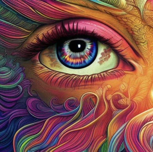 • ultra-detailed hyoerdetailed illustration, is a Gorgeous lovely gypsy with rainbows flowing from eye sockets in foreground centered, incredibly illuminated Clouds a Blaze Of Exquisitely vivid Color Harmonies 8k resolution, WLOP Dan Witz