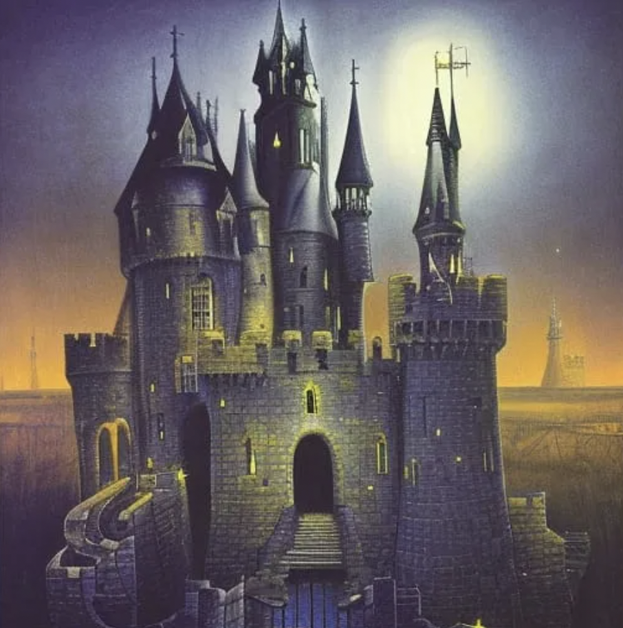 • illuminated Castle at night, Deep Color, Intricate, 8k resolution concept art, Natural Lighting, Beautiful Composition, Old sanctuary of death A perfect complete masterpiece painting by bosch, Philip Guston, Ralph Steadman, Eyvind Earle, Stephen Gammell, Ralph Bakshi, Frank Frazetta, Renaissance oil painting