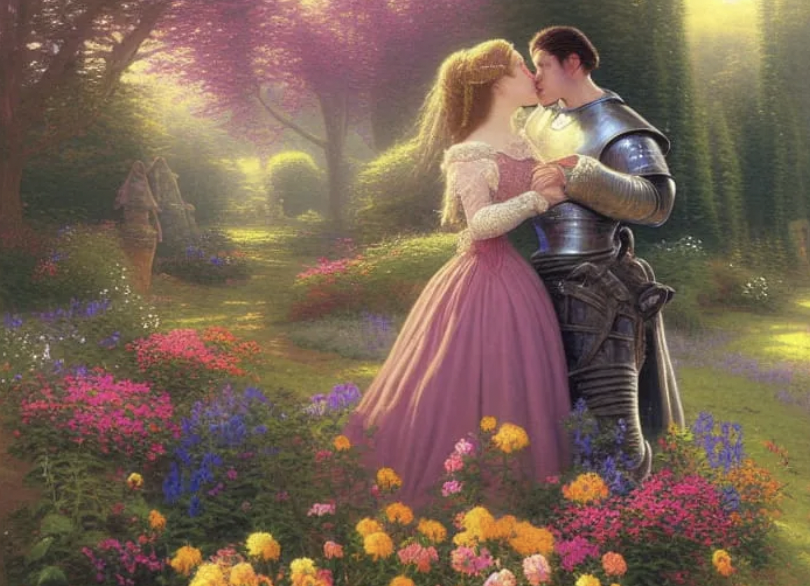 • the kiss painting, medieval knight and victorian lady, in love, romance book cover, standing in the garden, flowers iridescent, deep complementary colors, ethereal fantasy, hyperdetailed mist, Thomas Kinkade, matte painting gouache, ethereal fantasy, dynamic lighting