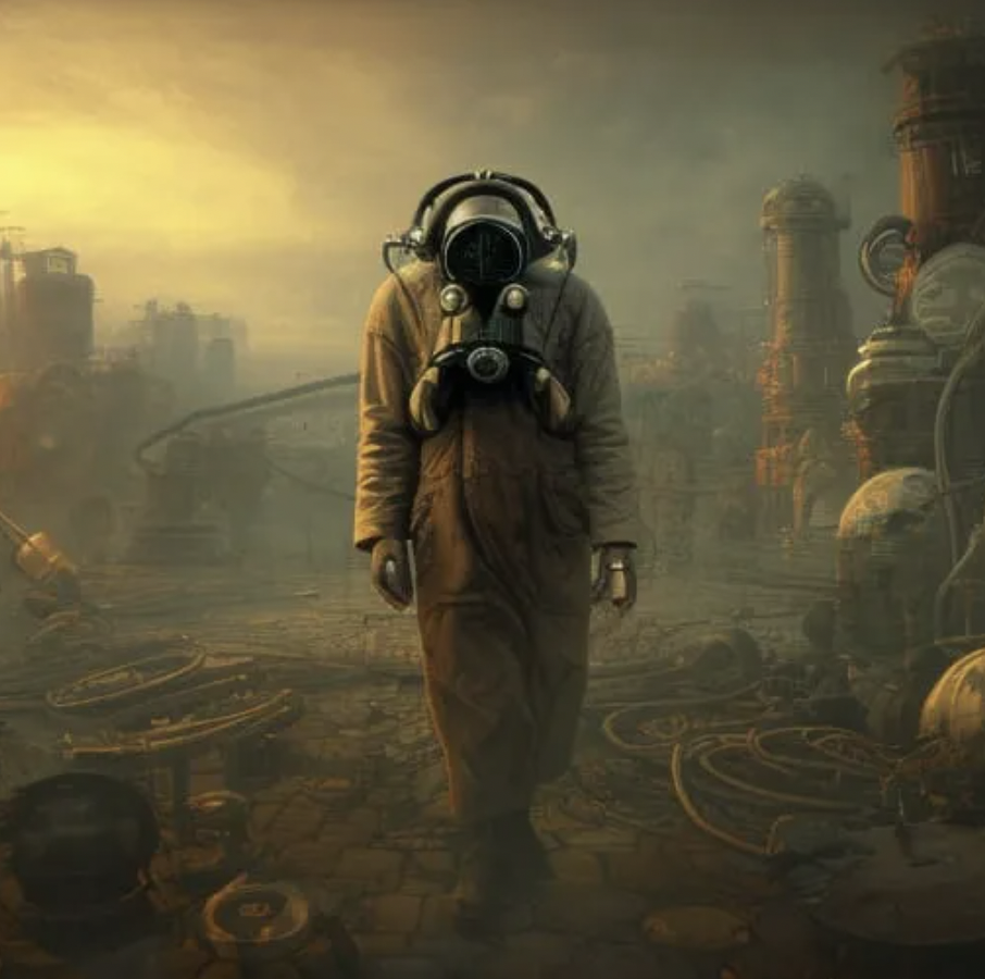 • hyperdetailed epic cinematic Futuristic Gas Mask in toxic gas, Deep Color, Intricate digital illustration, complex unique composition, 8k resolution HDR, dynamic lighting, masterpiece, reflections of twilight perfect complete masterpiece painting by bosch, Philip Guston, Ralph Steadman, Eyvind Earle, Stephen Gammell, Ralph Bakshi, Frank Frazetta, Beautiful Composition