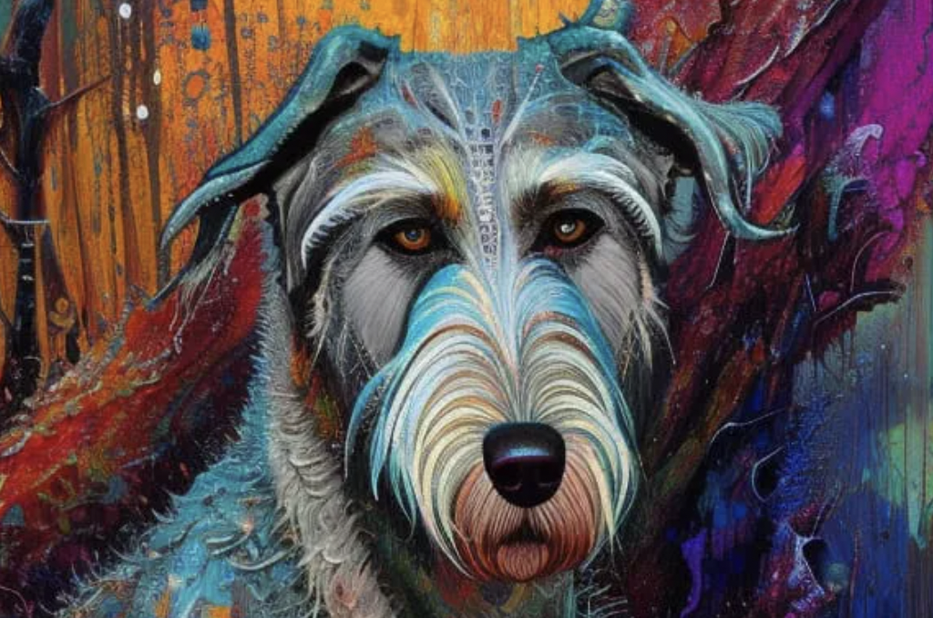 • Ceremonial Wolfhound, Intricate detail, award winning details, vivid landscape illustration, In the style of John O’Brien Inman, textured oil painting showing detailed brushstrokes, digital art, inspired by Carne Griffiths, terry gilliam, 8k resolution concept art Dan Witz complementary colors
