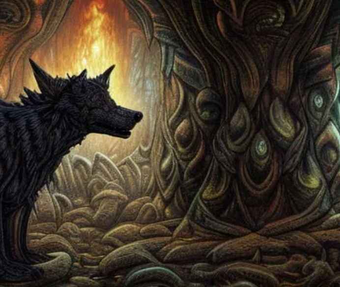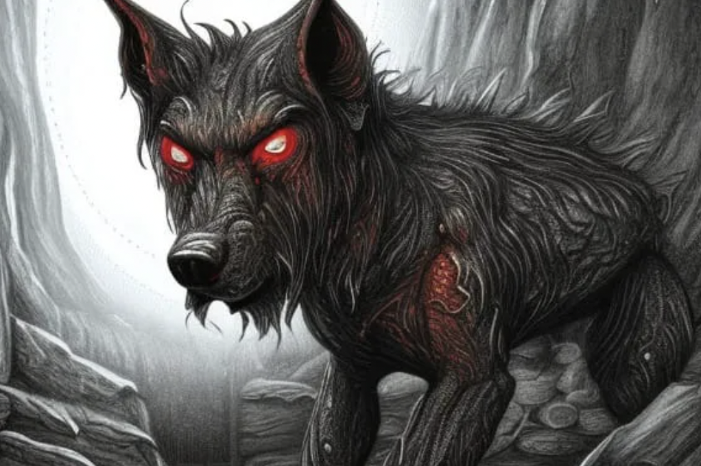 • hellhound in a dungeon, digital art dark realistic fantasy close up of ultra detailed n the art style of john o’brien inman folklore, Intricate detail, forest background, digital art in the style of Mary Vaux Walcott, Diego Gisbert Llorens, Tony Sart artwork is a hyperdetailed photoillustration with dynamic lighting, illustration, HDR