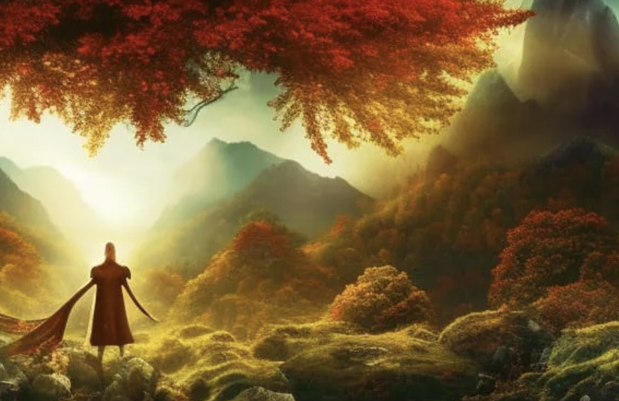 • treecore, branchpunk, Whirling autumn leaves on the wind between the mountains, Meticulously Detailed Dramatic Atmospheric 12K fantasy with color variety, photorealistic maximalist high-contrast complex intricate mind-boggling complicated filmic, adventurers in the shire scenery landscape