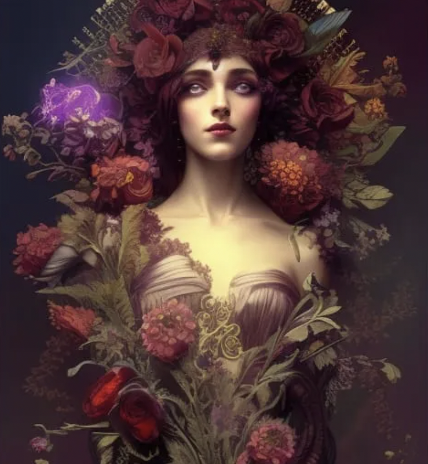 • Renaissance dystopian Flower Arrangement Deep Colors Artposter Intricate Art-Deco elements of the Mythological, Ultra Detailed portrait, 8k resolution concept art by Greg Rutkowski, Artgerm, WLOP, Alphonse Mucha dynamic lighting hyperdetailed intricately detailed Splash art trending on Artstation triadic colors Unreal Engine 5 volumetric lighting