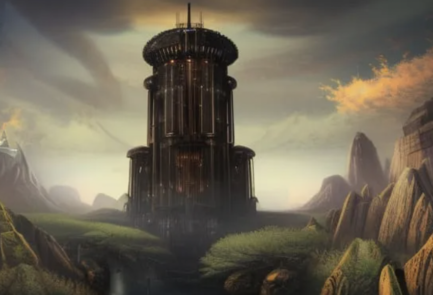 • symbolized ancient Otherworldly tower, Photo-Realistic Technologically, Advanced Machinery And Lush Clockwork Landscape, Legendary Explorer, The crusade, Harsh Machine, Soft Beautiful Landscape, streamlined dawn of history, in the style of Jim Burns