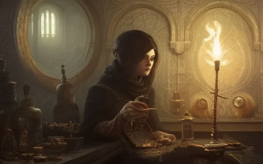 • Accomplice Of The Conjurer, glowing Luminous magical currents, unusual magic elements, Gorgeous hyper-detailed magical apothecary, intricate details, masterpiece illustration, inspired by Greg Rutkowski, photorealism, hyperdetailed, beautiful, mysterious, hyperrealism, incredibly detailed, mystery