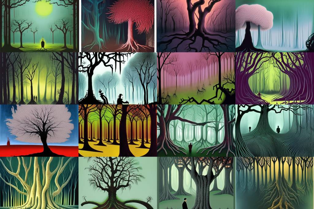 Try adding these to your AI art prompts for some crazy effects: birch tree forest, portal-tree, using “samhain” as an adjective, in the style of Edgar Allen Poe, in the style of Metallica & in the style of Ronnie James Dio, Painted in the third dimension using telepathy, Painted in the underworld, Cosmic tricked-out portal to hell, darkwave, barrens, thick layers of eldritch insanity.