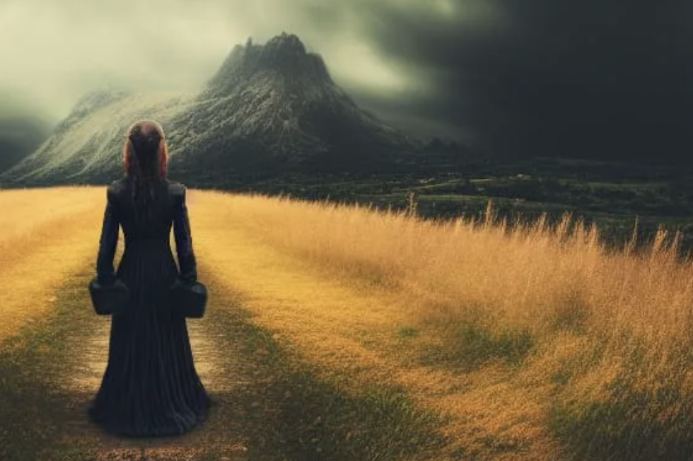 • 16k Resolution Ultra Realistic cinematic, victorian woman long hair, Cinematic Dystopian Brutalist Atmosphere, path through the meadow, mountains in the distance, dangerous ominous storm in the distance, Fantasy Style Spooky Landscape With dynamic lighting color graded Oil Painting Showing Textured Brushstrokes By John James Audubon And Glen Fabry