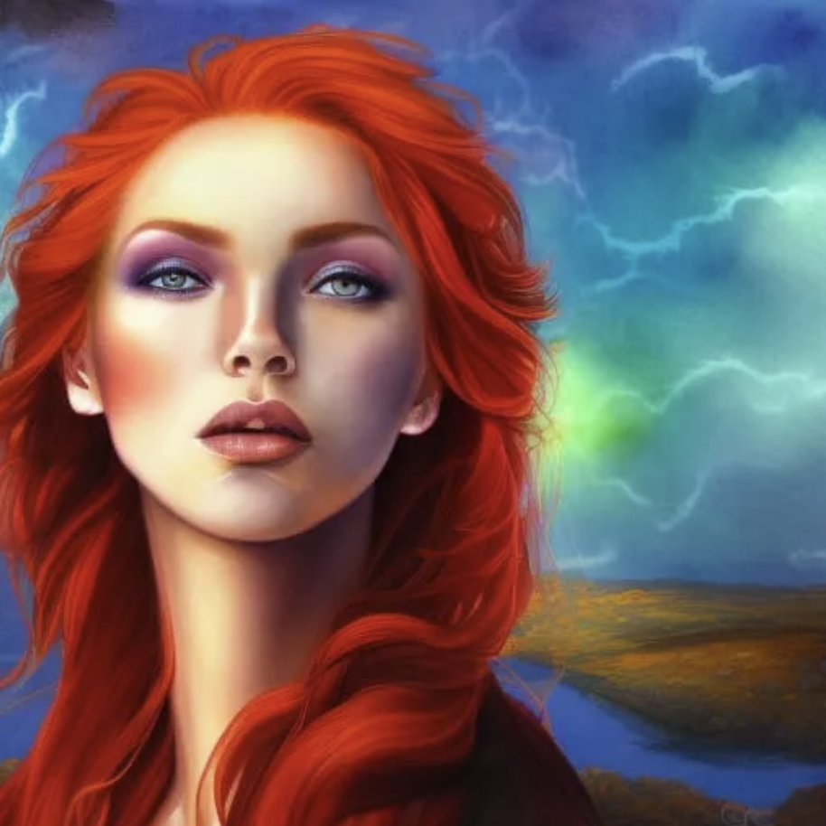 • hyperdetailed closeup of lovely red-haired lady on dramatic landscape, glowing candles, dramatic color contrasts, photorealism watercolor HDR wide-angle lens hyperdetailed magnificent digital illustration, Intricate detail, mixed media, oil painting In the style of John Constable