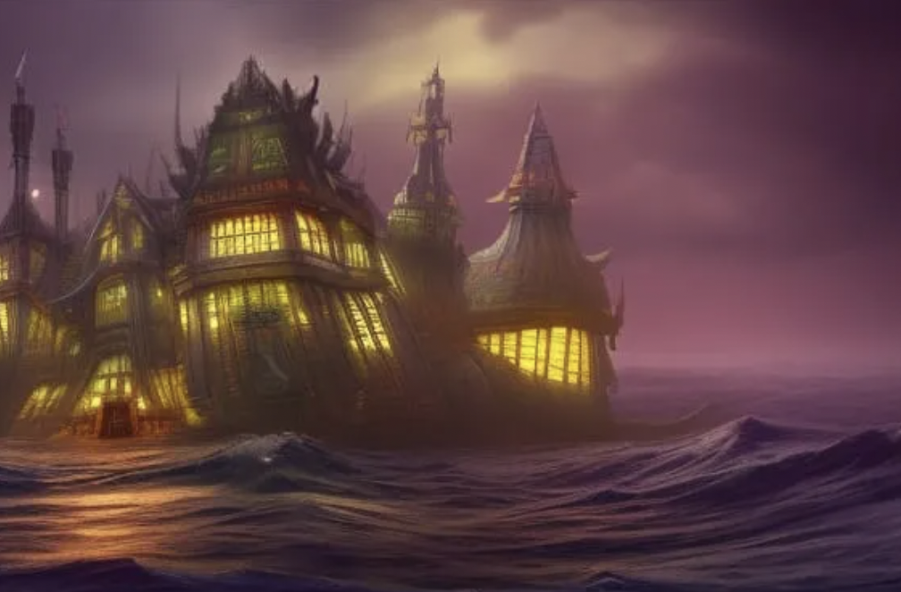• detailed enormous house-ship that is a floating Kingdom to thousands, a world of its own, stormy seas, deep color, fantastical, intricate detail, splash screen, complementary colors, fantasy concept art, 8k resolution trending on Artstation Unreal Engine 5, Midnight, lots of windows and lights