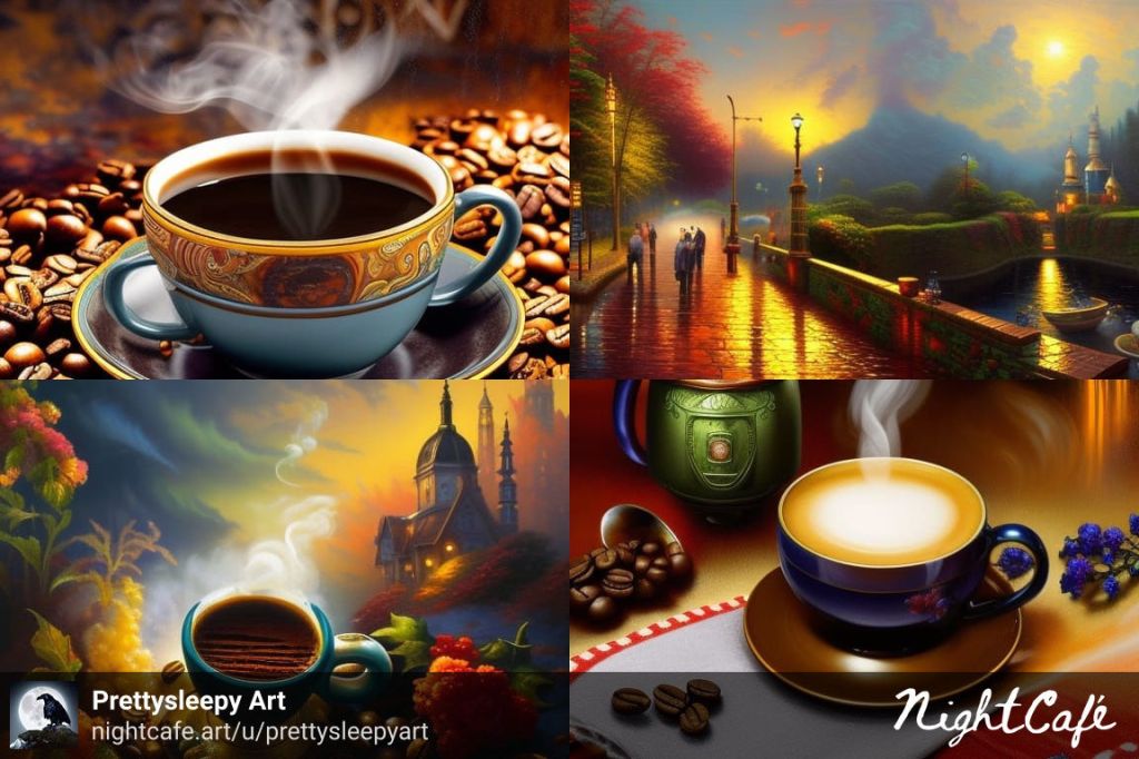 • steaming cup of coffee, award winning detailed steam, vivid color illustration, In the style of an insane caffeinated hyper psycho coffee lover, textured oil painting showing detailed brushstrokes, digital art, inspired by Thomas Kinkade, Alphonse Mucha, 8k resolution complementary colors (link on Nightcafe)