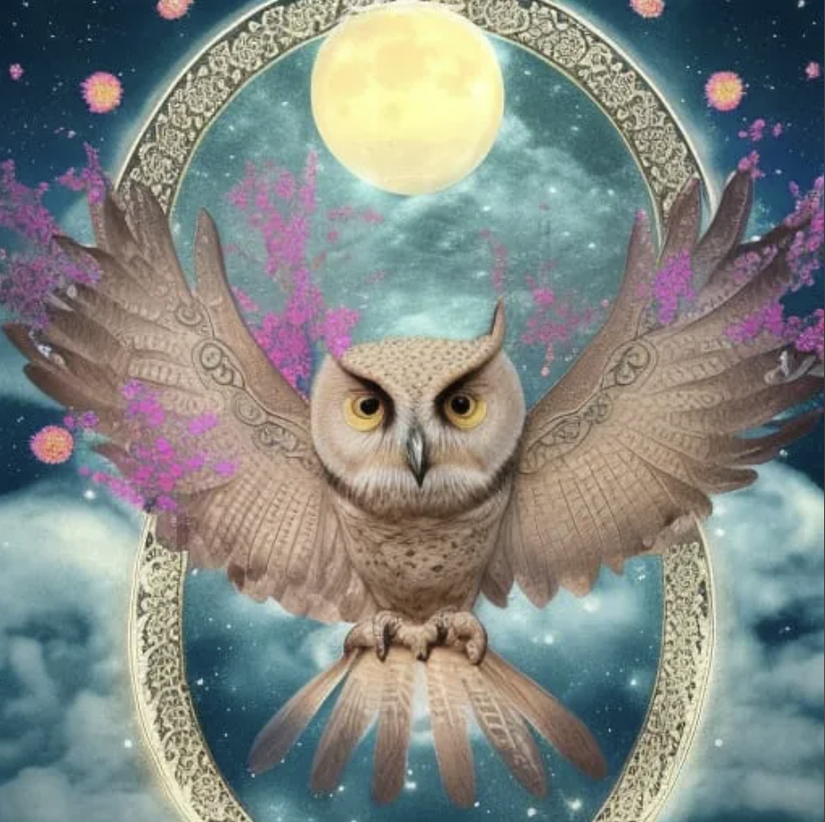 • painting, Gorgeous Clouds around Mind-Boggling detailed owl, Symmetrical, Blaze Of Exquisitely Warm Colour Harmonies Blender And Photoshop Blender Render Block Printing Blonde Woman In The Mystical Flowers Cinematic Celestial Full Moon 8k resolution concept art Thomas Kinkade