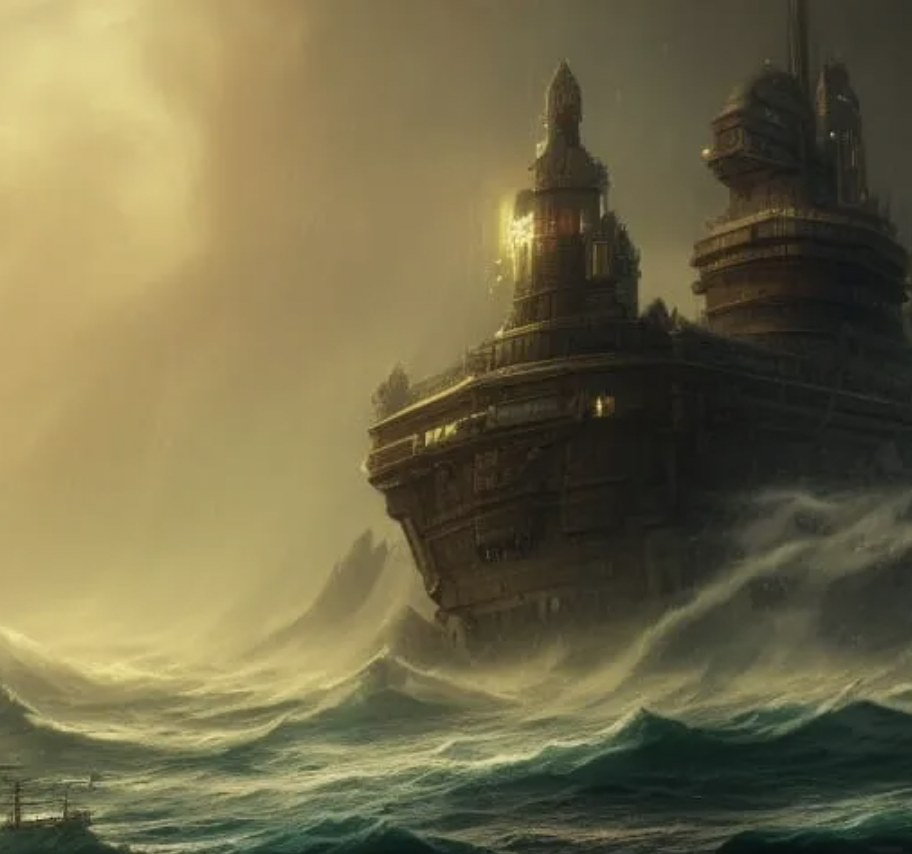 • detailed enormous house-ship that is a floating city to thousands, stormy seas, postapocalypse, detailed matte painting, deep color, fantastical, intricate detail, splash screen, complementary colors, fantasy concept art, 8k resolution trending on Artstation Unreal Engine 5