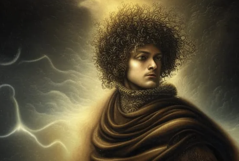 • mega detailed, intricately detailed renaissance nomadic young man, endless engulfing infinity thunderstorm, fluid perfect oil painting, complementary Color, modern art HDR 8k resolution, painting library, H.R. Giger