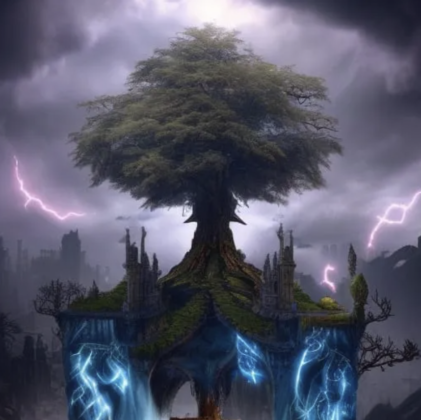 • Elements Of Lightning And Storm Clouds, castlecore, hazzard mega-detailed reaper-tree of potion-fantasy, ritualpunk edges, portal atmospheric Epic cinematic stunning intricate, detailed matte painting, deep color, fantastical, intricate detail, splash screen, complementary colors, fantasy concept art, 8k resolution trending on Artstation Unreal Engine 5