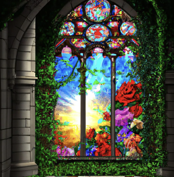 • large detailed stained glass window, heavenly sunshine beams shining through stained glass, hyperdetailed colorful vines ivy with thorns and daisies and red roses and castle, Epic cinematic brilliant stunning dramatic atmospheric maximalist digital matte painting, Splash art Mystical dappled sunlight, by Joseph Filer