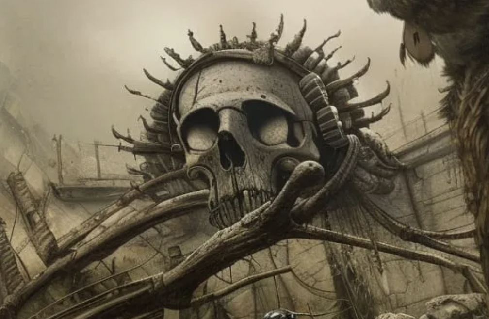 • In The Art Style Of George Walton Lucas Jr And James Gunn Gamekit Diego Gisbert Llorens Richard Anderson Hyperdetailed Giger Skull On Stone Wall Up Close In Foreground World War 2 Precise rendering, war, mythical, clearly detailed illustration, war is a state of mind