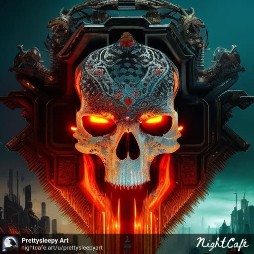 Prompt: hyper-amazing medieval pandemonium skull, cyber-wild award-winning splash art of unique intricate branchpunk skull in the style of Octavio Ocampo, Epic cinematic atmospheric 8k resolution, cyberpunk 2099 blade runner 2049 neon