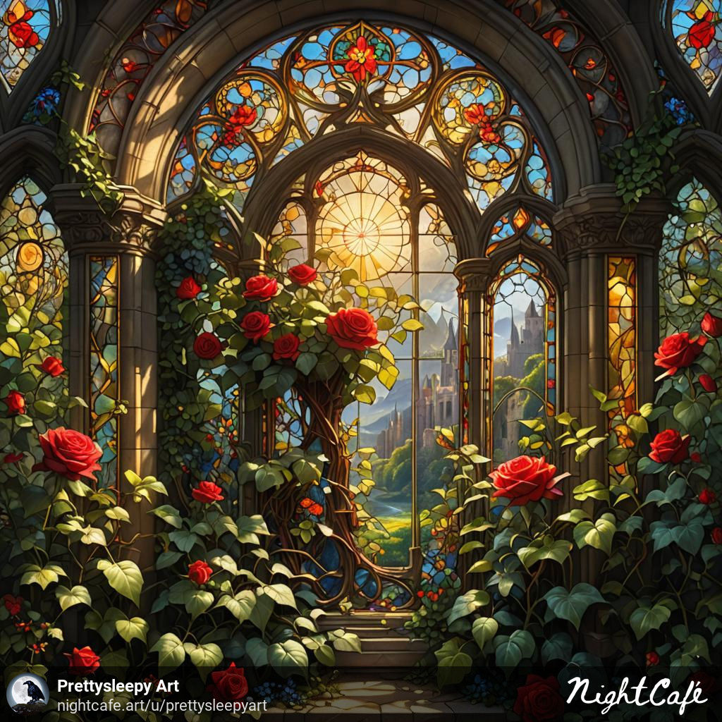 “large detailed stained glass window, heavenly sunshine beams shining through stained glass, hyperdetailed colorful vines ivy with thorns and daisies and red roses and castle, Epic cinematic brilliant stunning dramatic atmospheric maximalist digital matte painting, Splash art Mystical dappled sunlight, by Joseph Filer” Weight:1