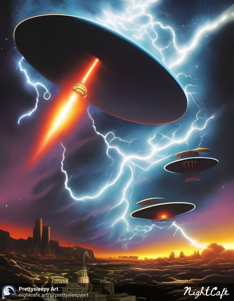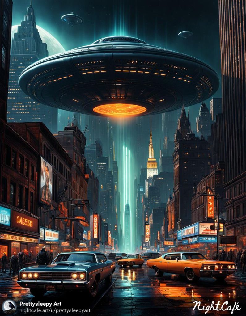 “sci-fi Aliens above the Dreamcore New York City Sinister Looming UFO, clearly detailed, style of Steve Argyle, Martin Deschambault, Michal Karcz, Syd Mead. glowy and epic. striking visualization of an invasion. breathtaking artwork.” Weight:1