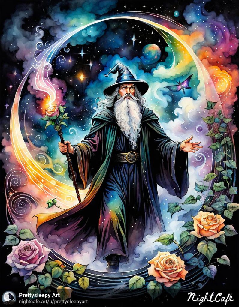 My Prompt: “a Wizard, Cartoon-like ethereal fantasy on canvas. spacecore-Gaelic-Bladerunner-fog roses and ivy flourishes whacked-out wallpaper, infinite universe on a black background, watercolor with outlines.” Weight:1