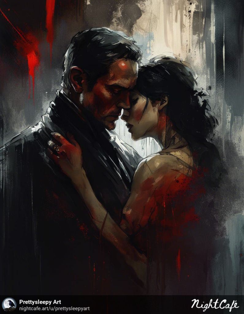 “epic poster art “close-up of vampire and woman embracing!!!”, Speedpaint_with_large_brush_strokes_and paint splatter by Jeremy Mann, Pino Daeni, Alphonse Mucha, Alex Maleev and Liz Gael, oil splash, Paint Strokes, Ink Drip, a masterpiece, 8k resolution, trending on artstation, highly detailed intricate, black_lineart, sharp focus” Weight:0.5