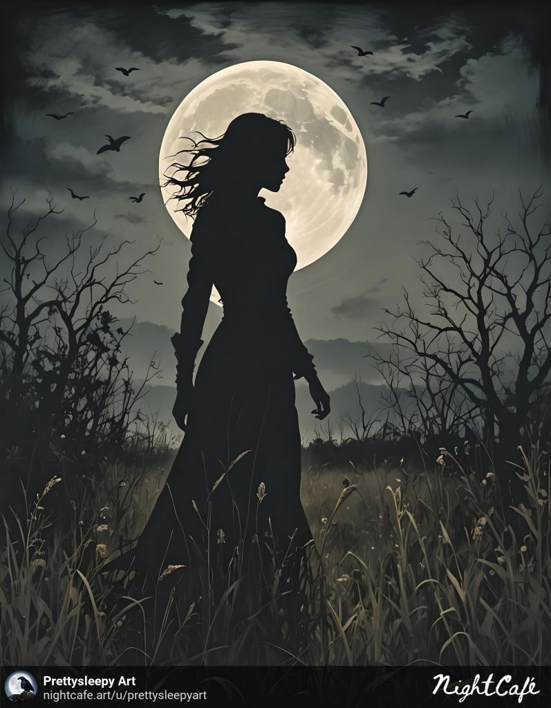 Prompt: negative sombre ominous Silhouette in meadow of sadness on windy full moon night, Tova Beck-Friedman Silhouette Art, eerie wacky fierce carefree sinister, spooky kosolov. Weight 1.