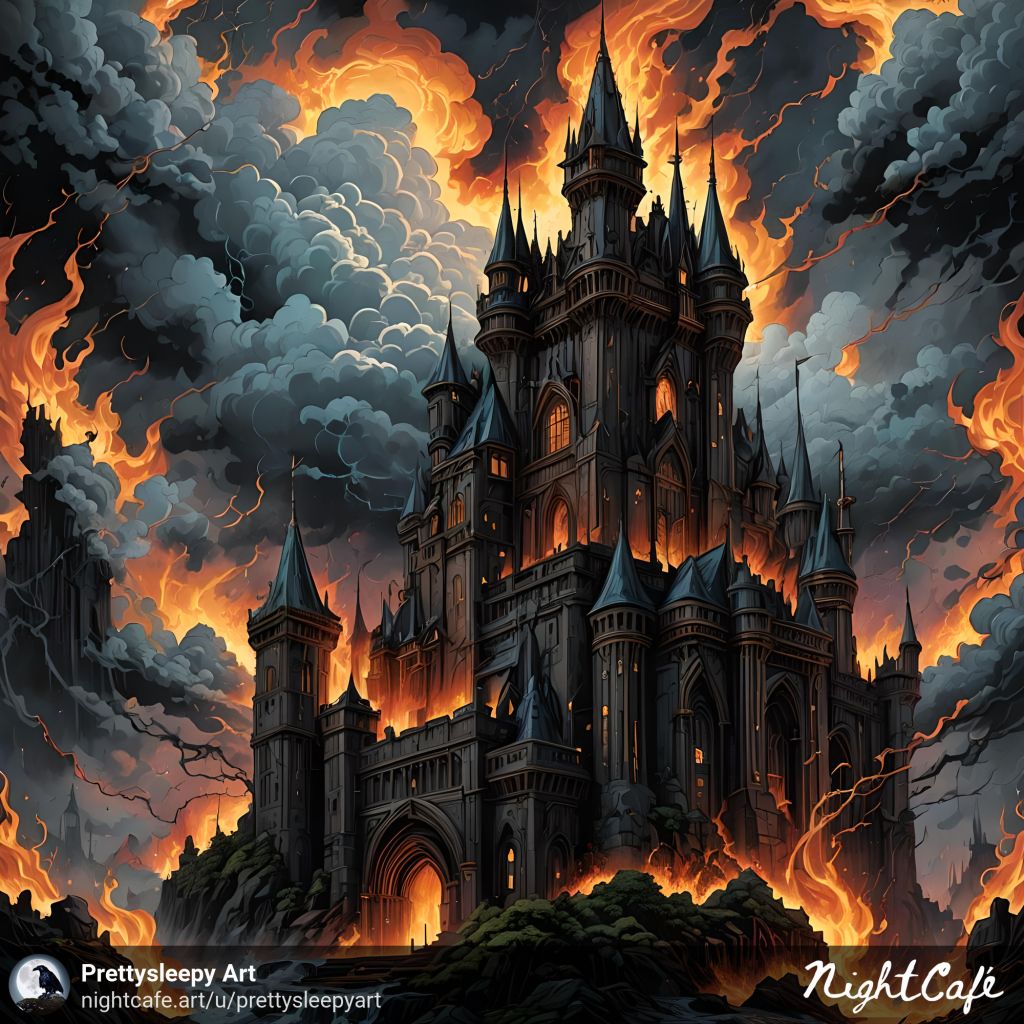 “Dan Mumford detailed formal intricate lines Aaron Horkey Goth darkwave Bastien Lecouffe-Deharme Lightning And Storm Clouds castle a shower flames Rule Of Thirds mythical Joe Fenton inspired by Android Jones beautiful colors Unreal Engine 5 mixed media painting stormpunk thrash metal cover James Jean” Weight:1
