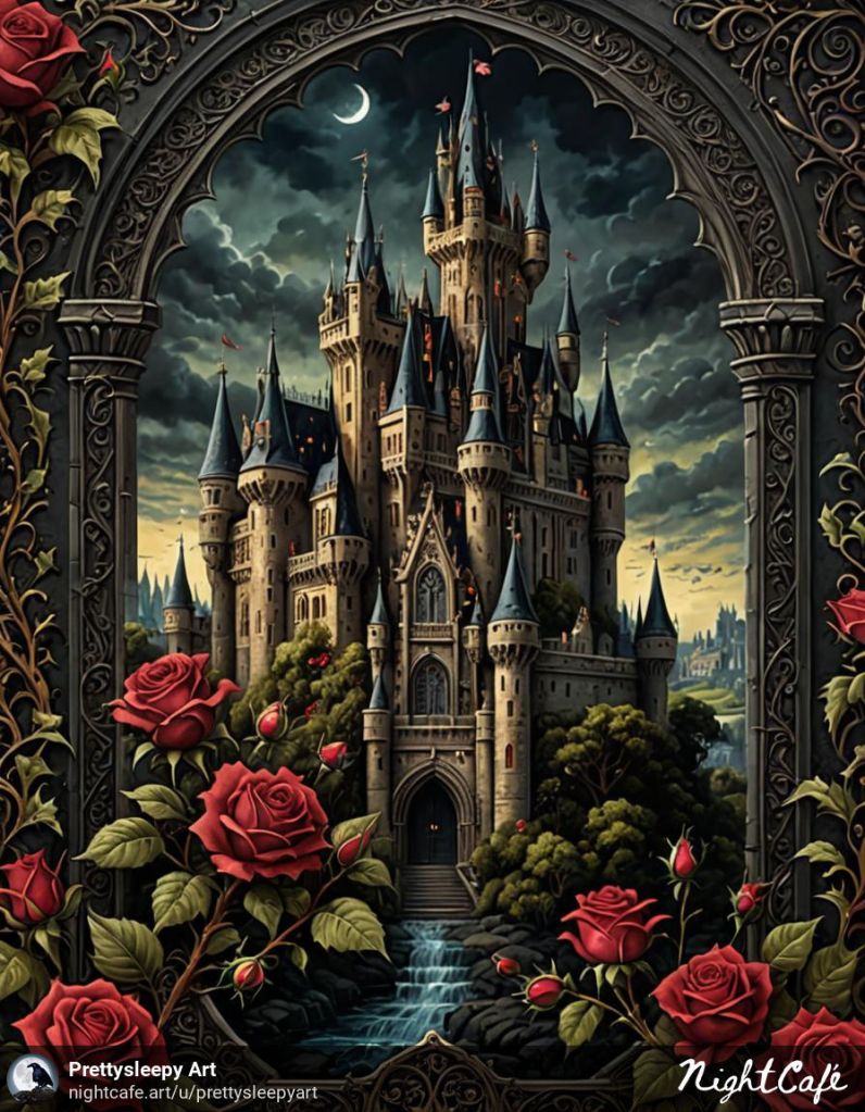“Gothic intricate and meticulously detailed, this dark romance book cover features roses-of-thorny-doom border, accents. stunning illustration. painting showing brushstrokes, insanely detailed matte painting with rough paint strokes and textures, with vines partially covering a dark etched castle that takes up the entire dark background. paisley castle shaped flourishes accents are metallic 3d, showing shine and reflections.