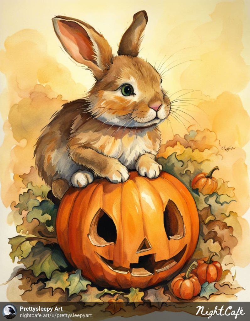 “adorable bunny on top of a Halloween carved pumpkin jack-o’-lantern. 🎃 whimsical fantastical painting by Beatrix Potter, & Richard Scarry & Jean-Baptiste Monge. artistic painting cute adorable professional style of Mary Vaux Walcott, Rah Crawford” Weight:1.6