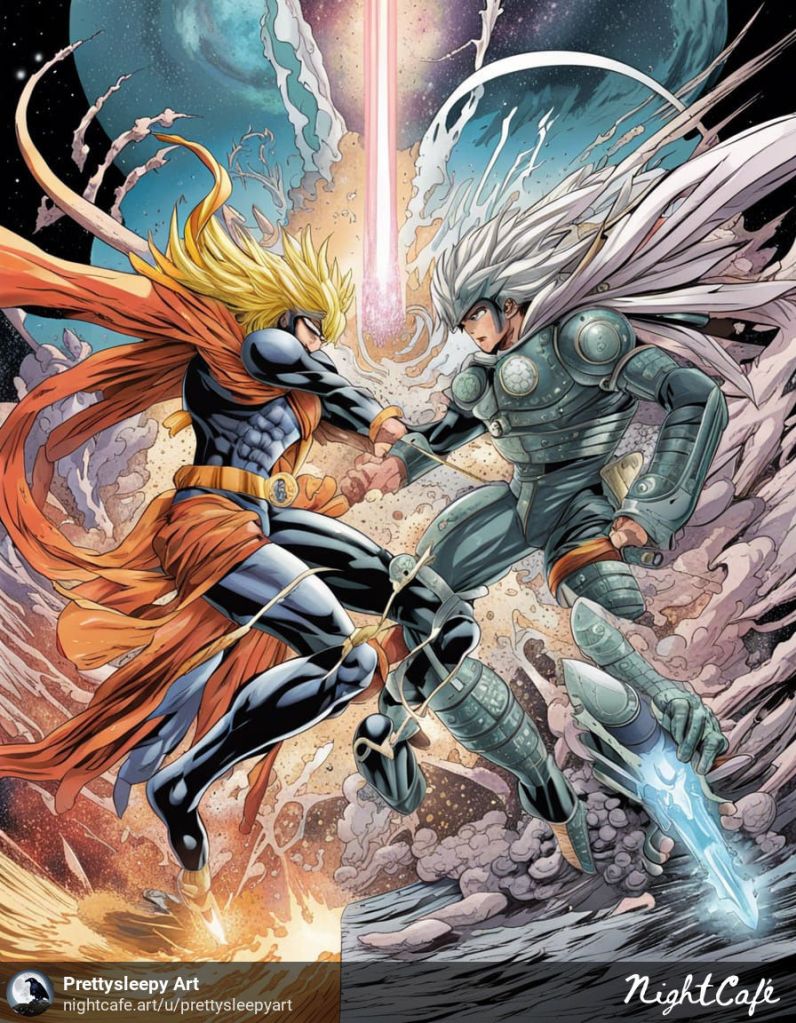 “anime manga villain battle. comic book style mega spacecore-comicbook-art, smooth clear details, fantasy. Style is a mix of bauhaus and William Blake.” Weight:1