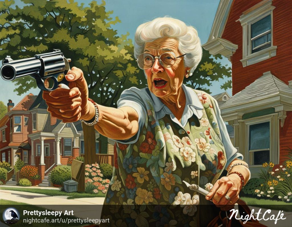 “angry suburban octogenarian woman pointing a gun on suburban street, dynamic action, action pose; intricate details, immense details, photorealistic, hyperrealistic, bold colors, centered, closeup shot; by Norman Rockwell” Weight:1